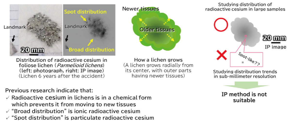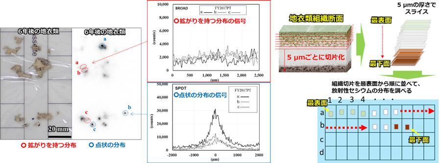 A research team of JAEA, Hosei University, and the National Museum of Nature and Science successfully identified the microscale localization of radioactive cesium in two chemical forms of ions and particles in lichens (lichen = a collective term for a symbiosis between a fungus and an alga) for the first time in the world, finally unveiling the mystery.
