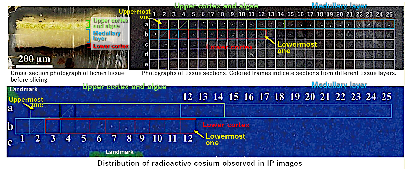 Commonly in both the lichens collected 2 and 6 years after the accident, it was found that “broad distribution” of radioactive cesium was localized in the lower cortex of the lichens. Further, when an IP image and digital microscope image of sample tissues were combined for each section, as shown in Figure 3, it was shown that the location of brown pigmented tissues was the same as the distribution of radioactive cesium.
