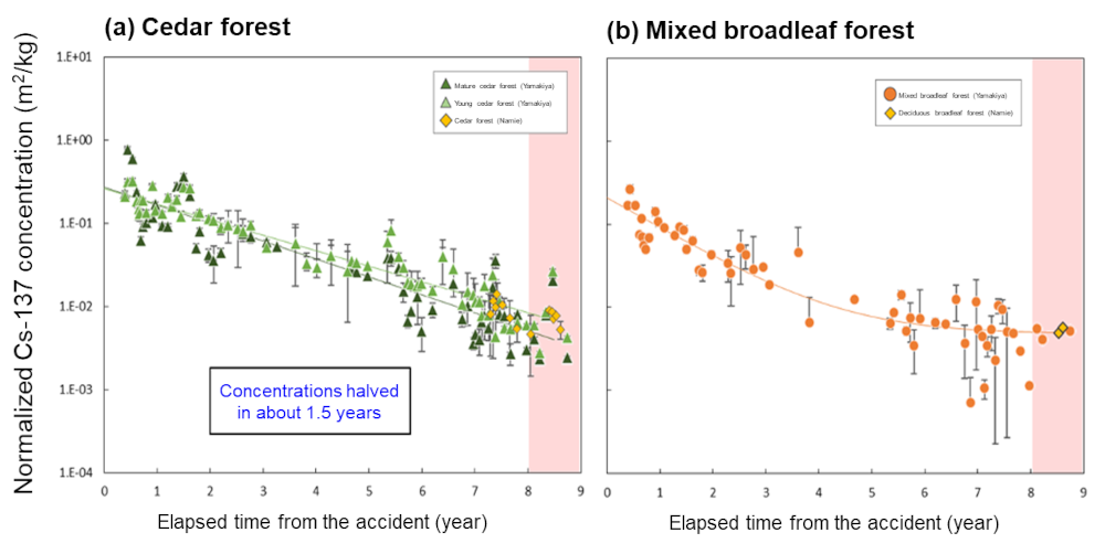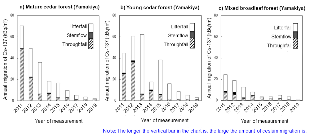 - Surveys in Kawauchi Village and Kawamata Town show that in both cedar forests and mixed broadleaf forests, the amount of radioactive cesium (137Cs) deposited through throughfall and litterfall tends to decrease over time.