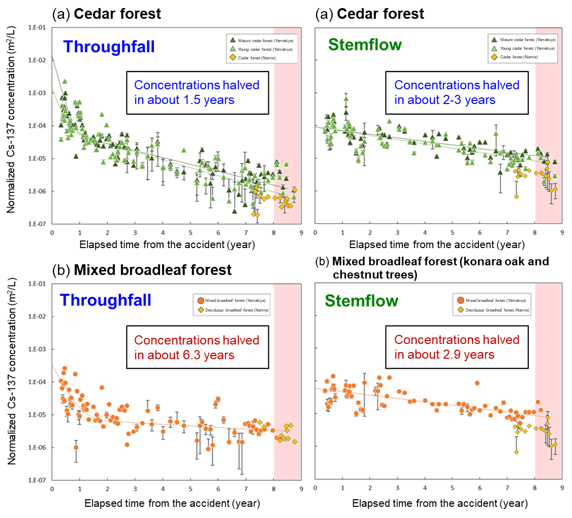- In the above areas, 137Cs concentrations in stemflow indicated a tendency to decrease overall. This shows that although 137Cs still exists in stemflow, its contribution to the total deposition amount is low.