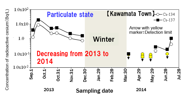 AConcentration of radioactive cesium in stemflow was investigated in Kawamata Town, Fukushima Prefecture. It was observed that the concentration of radioactive cesium in suspended states is decreasing, but decrease of cesium in dissolved sates was not observed.