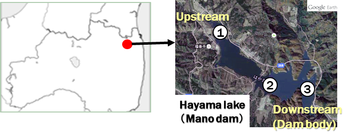 Fig.1 Sampling spots at Hayama lake (Mano dam)