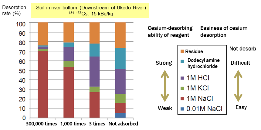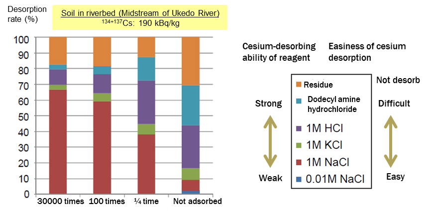 ASediments in riverbeds and river bottoms of the Ukedo River in Fukushima Prefecture strongly adsorb radioactive cesium. Even when the sediments are immersed in salt water, more than 80% of the radioactive cesium remains adsorbed.