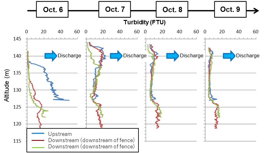 AInvestigations at the Ogaki dam in Fukushima Prefecture have revealed that the flow rate downstream of the dam is low even during periods of high reservoir water levels. Therefore, it appears that it is difficult for reservoir bed sediments to be resuspended. The turbidity at the surface of the lake is due to sediment inflow from upstream.