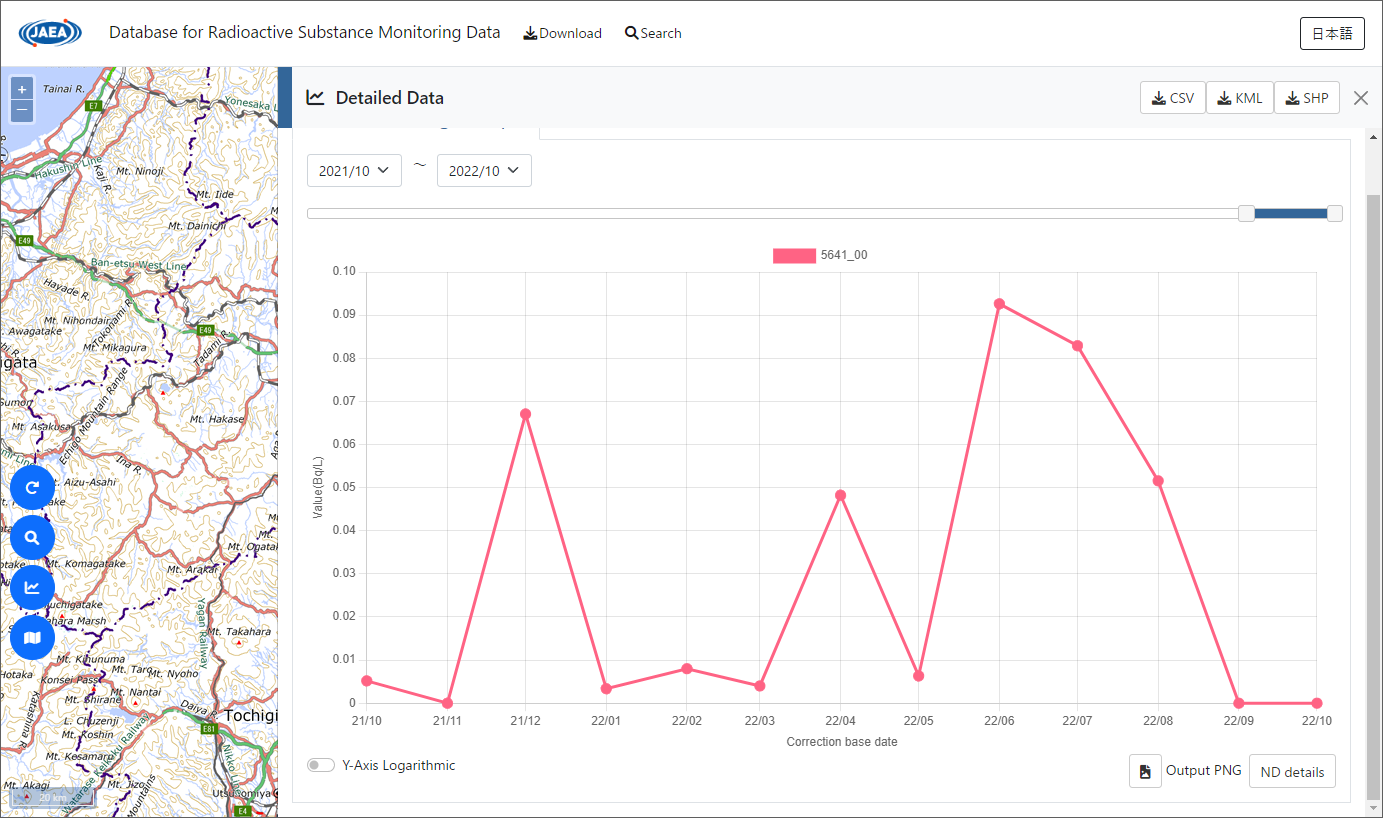 Tritium concentrations in river water are monitored by Fukushima Prefecture. You can check the concentrations by clicking “RIVER WATER” on the top page and following the same procedure.