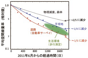 航空機モニタリングの結果によれば、平均的な空間線量率は事故後4年間で約3分の1に減少したと報告された7)。普段人間が生活している場に比べると航空機モニタリングで観察された空間線量率の減少は遅いことがわかる。これは、福島では森林の面積が全体の6~7割を占めることを考慮すると妥当な結果である。