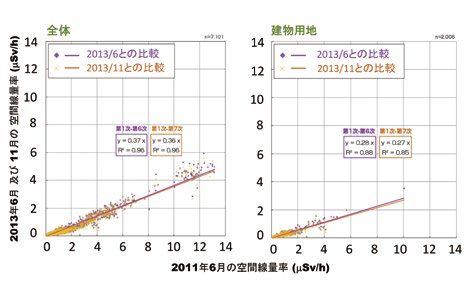 空間線量率の減少に影響する2つの要因が存在する。一つ目はすでに見たように土地の利用状況である。図3は、80km圏内全体と建物用地における走行サーベイの結果を、2011年と2013年との間で比較したものである4)。建物用地における空間線量率の減少が速いことがわかる。一方、森林地域における減少は遅いことも確認されている。