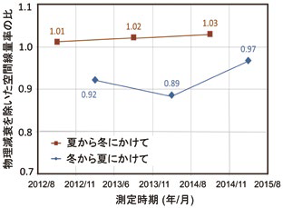 撹乱のない平坦地の空間線量率の減少に注目すると、空間線量率の減少が1年のすべての季節で均等に起きるのではなく、ある時期に特に速く減少しているように見える。図4は、特定の期間に物理減衰以外の要因で空間線量率がどの程度減少したかを示している。図に示した値が1の場合は、物理減衰のみにより空間線量率が減少したことを意味している。