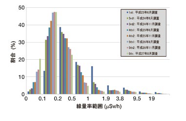 平坦地上の測定をもとに作成した空間線量率の頻度分布を図5に示す。各時期における測定結果を異なる色の棒グラフで表している。0.2μSv/h以上の地域が時間とともに減ってきており、現在は0.5μSv/h以下の地域が全体の90%を占めていることがわかる。