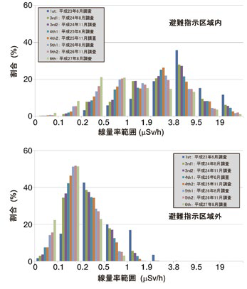 図6では、避難指示区域の内と外を分けて空間線量率の分布を示す。当然、避難指示区域内のほうが高い空間線量率分布を示すが、区域内でも0.5μSv/h以下の比較的空間線量率の低い場所が相当割合存在しており、避難指示区域の指定が、純粋に空間線量率だけでは行われていないことがわかる。