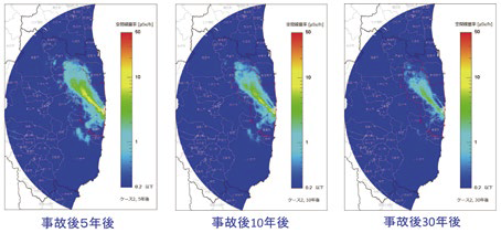 その上で、土地利用状況と避難指示区域の区分でデータを分類して自動車サーベイ結果の統計解析を行い、状況ごとの代表的なパラメータを決定し、これを用いて将来予測を行う。図7は80km圏内を対象に事故後5年、10年、30年における空間線量率分布を予測した結果である11)。10μSvを超える高線量域の領域は、30年後にはごく限られた地域にまで減少することが予測されている