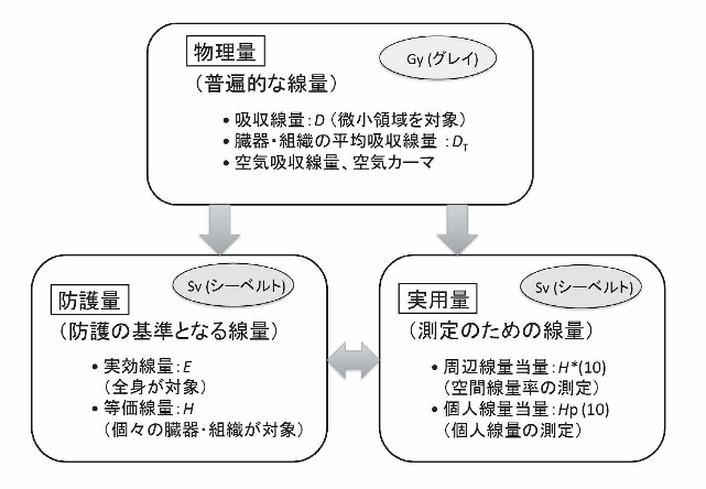 以上の観点から、防護の基本となる防護量である実効線量と等価線量、及び、防護における線量測定で直接に用いられる実用量である周辺線量当量と個人線量当量、並びに空間線量率測定に広く用いられてきた空気吸収線量を主に取り上げる。実効線量、等価線量、周辺線量当量、個人線量当量はいずれもシーベルト(Sv)の単位で表されることもあり、しばしば混同されて用いられるため、これらの違いを明確にする。