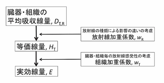 実効線量を計算する過程の概念図を図3に示す。実効線量を計算する基礎となるのは、2.2節で説明した、人間の臓器又は組織が放射線から受ける平均吸収線量 D T,Rである。 D T,Rは臓器又は組織T(肺、甲状腺、赤色骨髄等)が、放射線R(γ線、電子線、中性子線等)により受ける平均吸収線量である。