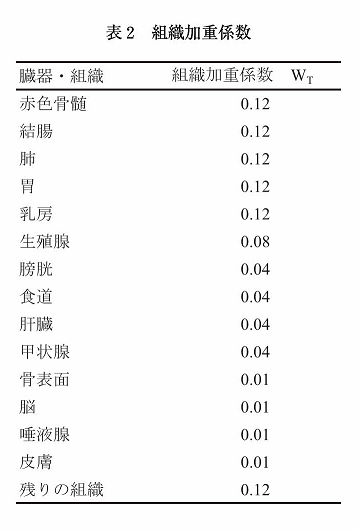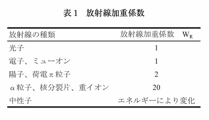 放射線の人体影響の特徴を考慮するために、臓器・組織の平均吸収線量に2種類の補正を施すことで実効線量が求められる。まず、放射線の種類による人体影響の違いを考慮するための補正係数(放射線加重係数:radiation weighting factor) w Rを臓器線量に掛ける。放射線加重係数の値を表1にまとめるが、例えば、γ線には1、陽子線には2、α線には20という値が与えられている。これの意味するところは、ある臓器に同じエネルギーを付与する場合でも、α線はγ線に比べて20倍影響が大きいと想定しているということである。