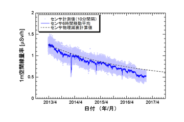 図9.4は福島県川俣町山木屋に設置した気象観測装置一体型放射線センサーで観測された1m空間線量率の時間変化を示したものである。図には放射性セシウム(134Cs及び137Cs)の物理減衰による計算値も合わせて示している。1m空間線量率は物理減衰に従い減少傾向にあることがわかる。各年の冬期に見られる線量率の低下は積雪によるγ線の遮へい効果と考えられる。また、2015年11月以降の空間線量率の低下は、周囲の除染作業によるものであることが確認されている。