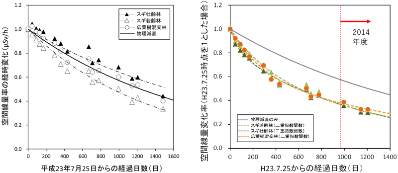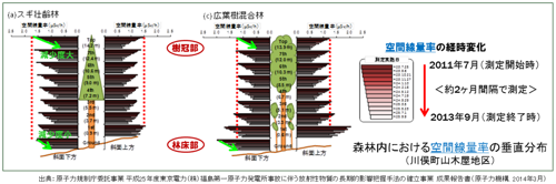 以上のプロセスを経て森林内における放射性セシウムの分布は変化し、それに伴い森林内の空間線量率も時間とともに変化すると考えられる。林内の空間線量率は、森林に隣接する生活圏での外部被ばくや、今後の森林整備における林業従事者の被ばく線量低減の観点からも重要な地点である。このため、森林内の空間線量率の変化傾向に関する調査が実施されている。