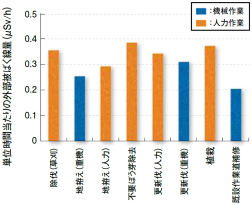 外部被ばく線量は、基本的に作業時間が長い作業種ほど多くなる結果が得られている。林野庁の調査では、作業道補修など大型作業機械内で過ごす時間が多い作業は、除伐(造林木の生育の支障となる立木を除去する作業)や植栽など野外で行うものに比べて値が低い傾向が見られた。単位時間当たりの外部被ばく線量をみると、同じ作業でも機械を使用する場合と人力で実施する場合を比較すると、作業機械を使用した場合には1割程度の外部被ばく線量の低減が見られた(図11.1)。