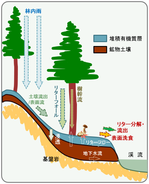 山地森林に沈着した放射性セシウムの一部は、降雨を起点として発生する土壌流出や表面流に伴って、土壌粒子に吸着した粒子態あるいは表面流水に溶け込んだ溶存態として森林域から流出し、河川やダム、ため池等を通じて人の生活圏やその隣接地へ移動するものと考えられる。一方、森林内に留まった放射性セシウムは、樹木や草本、キノコ等の生活活動とともに、落葉落枝の腐植を伴う土壌生成過程などにより森林生態系内を移動し、時間とともに森林内における分布が変化すると考えられる。