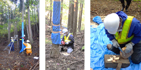原子力機構では、森林内の各部における放射性セシウムの分布状況を把握するため、川内村荻地区においてスギ林を対象とした調査を実施している。まず、調査地に分布するすべてのスギ立木の樹高や胸高直径(地上1.3 m高さでの幹の直径)を計測し、最も頻度の高い胸高直径を持つ立木5本を選定した。伐倒時には、伐倒したスギが土壌に接触することで土壌中の放射性セシウムが伐倒したスギに付着することを防ぐため、地際周辺をブルーシートで覆うなどの処置をとった(図2.2)。
