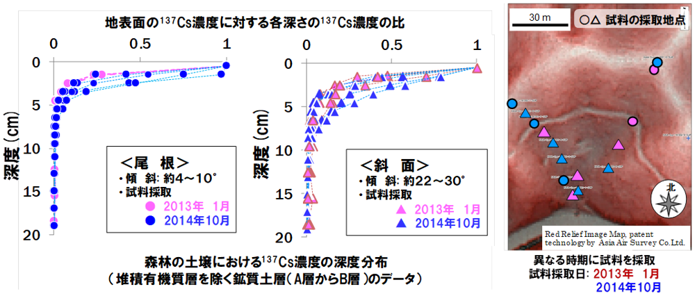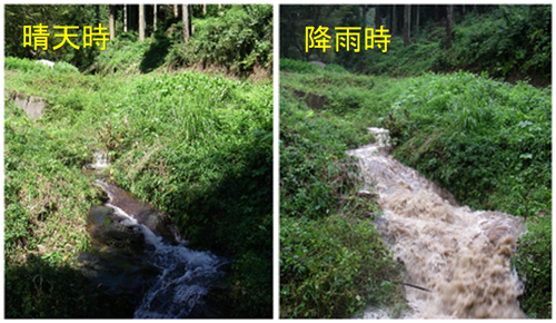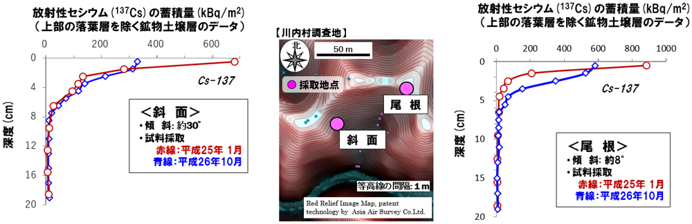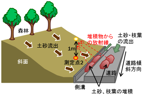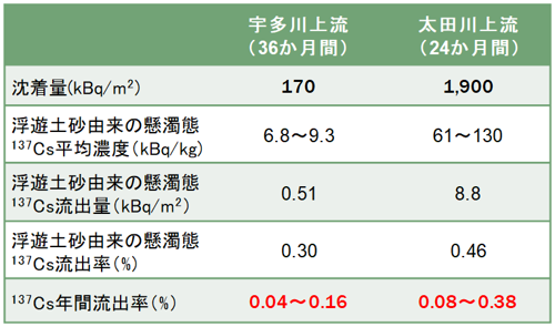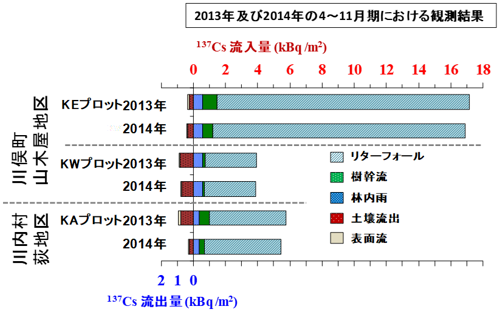 林床に直接沈着ないしは移行した放射性セシウムは、落葉落枝を含む堆積有機物層からその下の鉱質土層に移動する。一方で、土壌粘土粒子と強く結合することから、鉱質土層へ移動した放射性セシウムの大部分は、表層部分に貯留されている状態にある。この状態は、放射性セシウムが可溶化して下方へ移動し、地下水を汚染する可能性が極めて低いことを示す一方で、降雨や融雪による土砂流出時に、土粒子に吸着した高濃度の放射性セシウムも一緒に流出し、その結果、下流水域や河川氾濫原への集積(再汚染)が生じる可能性も示唆している。このため、国立環境研究所では、水田や市街地を主とする下流域に比べ、森林を主とする上流域が相対的に高汚染状態にある浜通り地方北部河川流域を対象として、山地森林流域における放射性セシウムの流出実態を把握するため、2012年度から水文観測や採水調査を継続実施している。