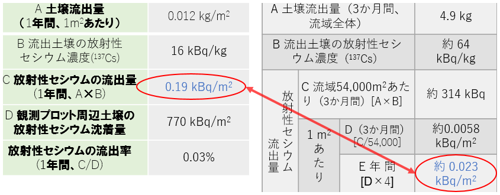 観測地における放射性セシウムの林床からの流出量は、周囲から表面流や土壌移動に伴う放射性セシウム流入が生じないようにステンレス製あるいはプラスチック製の板で囲った観測プロットを設置し、一定面積を持つ観測プロットから流出する表面流量(リットル/m2)と土壌移動量(kg/m2)を観測し、表面流水と土壌の放射性セシウム濃度(Bq/リットル及びBq/kg)をそれぞれ乗ずることにより、林床からの放射性セシウム流出量を単位面積当たりで算出する。