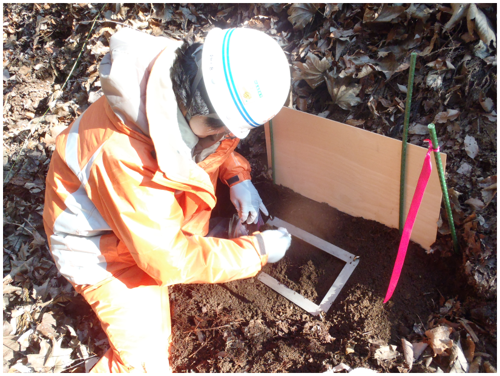森林土壌については、スギ立木を伐倒した同じスギ林において、堆積有機質層と土壌層を採取した。堆積有機質層は、未分解の状態にある落葉落枝等が堆積したリター層と、リター層の下にあり、落葉落枝等が一部あるいは原形が不明なほど分解した腐食層に分けられる。この落葉落枝等の分解の程度により放射性セシウム蓄積量が異なる可能性があるため、リター層と腐食層を区別して採取した。土壌層は、スクレーパープレートで深度20 cmまで1 cmごとに採取した。放射性セシウム蓄積量は、試料の放射性セシウム濃度と1 m2あたりの重量から算出した。