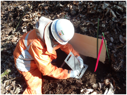 原子力機構が採用している立木試料の採取方法は、梶本ほか(2014)により整理された方法に準拠しており、以下に述べる農林水産省および林野庁による調査においても採用されている。ただし、森林土壌の採取については原子力機構とは異なり、はじめに落葉層(土壌の上にある落葉・落枝とそれらの腐朽した腐植からなる堆積有機物層)を採取し、その後、採土円筒を土壌中に打ち込み、深さ別4層の土壌(0-5、5-10、10-15、15-20 cm)の試料を採取している。