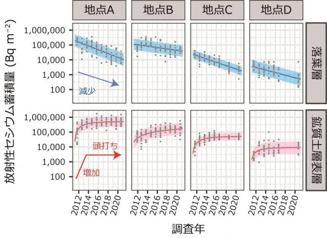 事故から5年後の時点では、落葉層の放射性セシウム蓄積量は減少傾向を示し、深さ5cmまでの鉱質土層表層の放射性セシウム蓄積量は増加傾向にあることから、事故後初期に落葉層に存在していた放射性セシウムが時間経過と共に鉱質土層表層に移動していたと推定されています*1。今回、その後も含めた計10年間の変動を複数のモデルを使用して解析したところ、多くの調査地で鉱質土層表層の放射性セシウム蓄積量の増加が止まり、ほぼ一定値になっていることが明らかになりました(図2)。