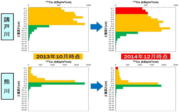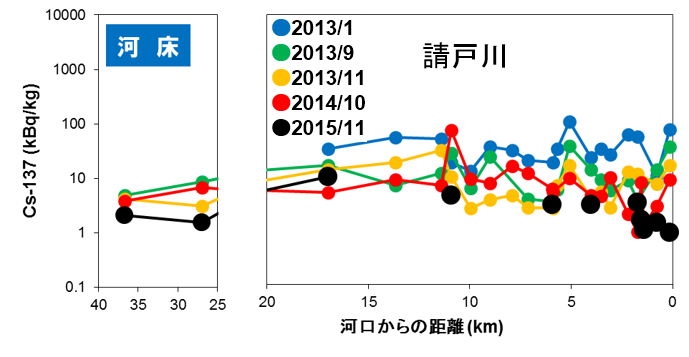 福島第一原発事故により放出された放射性セシウムの河川を介した移動に伴う放射性セシウム分布及び空間線量率分布の変化傾向の特徴が明らかになる(環境省2017;Kitamura et al.2014;Kitamura et al.2015;原子力機構 2013;原子力機構2015;Yamaguchi et al.2014)とともに、その変化を理解するために重要な放射性セシウムの河川中における動態についても知識が蓄積された。空間線量率については、事故後間もなくの土砂堆積によって、一部の河川では河川敷の線量率が周辺よりも高くなったが、以降、全般に物理減衰よりも早く減少することが確認された。河川敷土壌の深さ分布からも、空間線量率に影響を及ぼす表層土壌の放射性セシウム濃度が低下していく傾向が確認された。また、河床の放射性セシウム濃度は河川敷に比べて一桁から二桁低い濃度で推移していることが確認された。