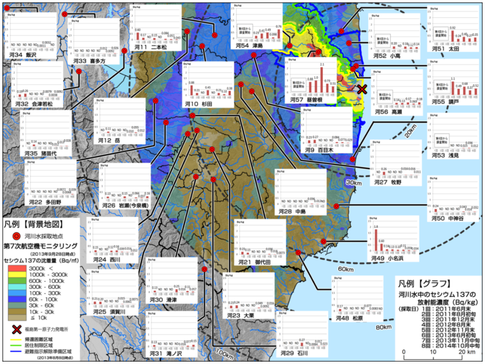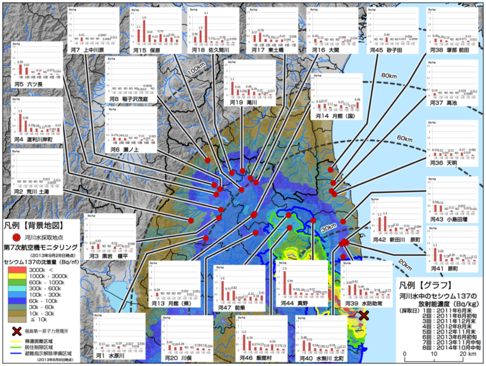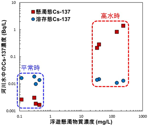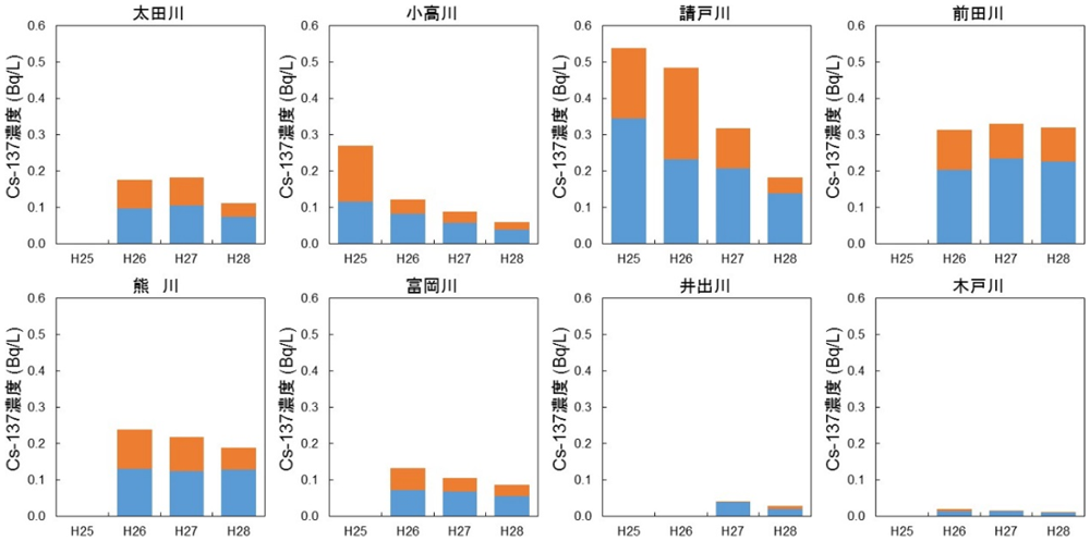 平常時は、放射性セシウムの大部分が溶存態で存在している。溶存態放射性セシウム濃度は、太田川・請戸川・前田川・熊川では0.1Bq/Lオーダー、小高川・富岡川・井出川・木戸川では0.01Bq/Lオーダーの濃度レベルであった。懸濁態放射性セシウム濃度は同レベルか、さらに一桁低い濃度レベルであった。2013年以降、濃度レベルは変わらず、逓減傾向で推移している。これは、チョルノービリ(チェルノブイリ)事故等と同様に、初期の急激な減少から中期過程に移行したことを示す。