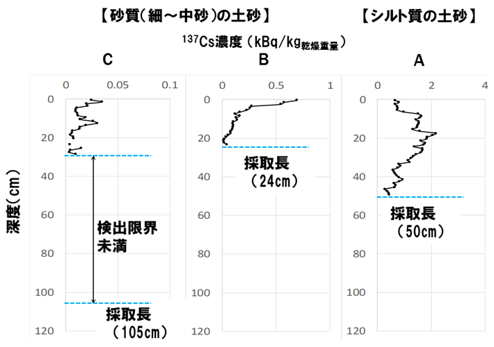 図5.1より、A地点にはシルト質の土砂が堆積しており、B地点とC地点には砂質の土砂が堆積している。図5.2より、シルト質の土砂の137Csが他の地点より1~2オーダー高いことが分かる。河口では、シルト質の土砂は凹地のような窪みに堆積する傾向がある。しかしながら、図5.1より、シルト質の土砂の堆積は河口において限定的である。