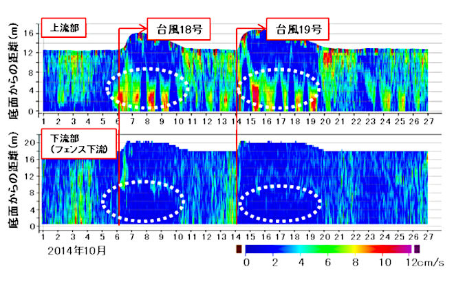 鉛直流速分布の連続観測の結果、出水時に上流部の中層から下層にかけて流速が顕著に速くなることから、濁水は上流部の観測地点では中層から下層にかけて進入しているものと考えられる(図4.6)。一方、下流部では出水時においても平水時とほとんど変わらない流速であった。なお、流速分布は日周期での変動性が認められるが、この要因は現在のところ不明である。