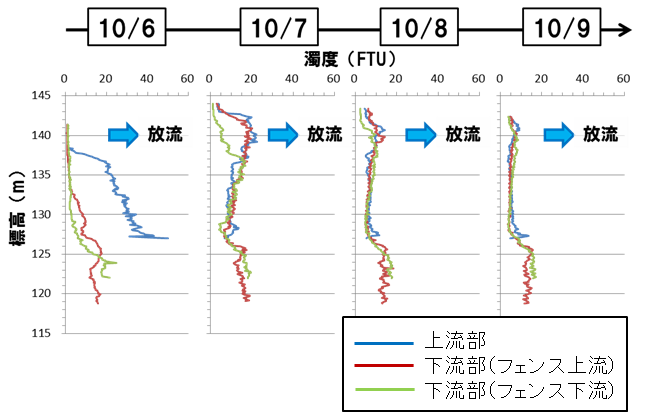 図4.7に湖内の濁度鉛直方向分布を示す。出水直後の10月6日の時点の上流部で濁度が最大約50 FTUとなるが、下流部では最大約20 FTU程度であった(1 FTUはおよそ1 mg/L)。あわせて、図4.8に下流部の水温鉛直方向分布を示す。この結果から、形成されている水温躍層は大きく破壊されていないことからも、全層が混合して濁水化するような大規模な出水イベントではなかったことが言える。そのため、下流部の下層で濁度が高い要因としては、出水時の流入水の影響ならびに夏期に貯水池内に形成された浮泥層によるものとで、底質の巻き上げの影響によるものではないと考えられる。
