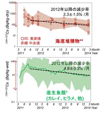 図6.2 海底堆積物と底生魚類中の放射性セシウム濃度の経時変化の比較