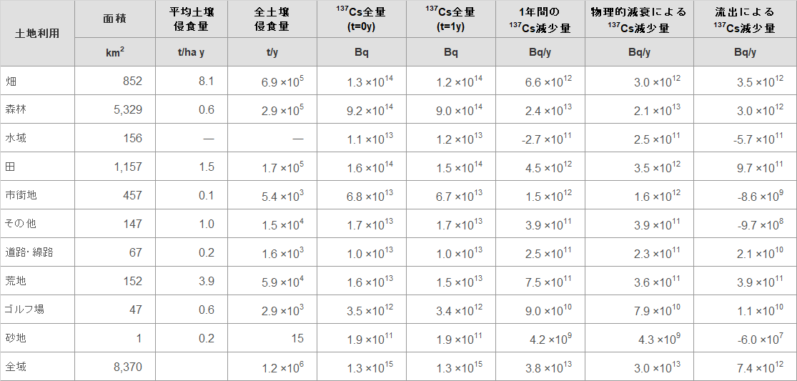 | 河川 | 流域面積 (km2) | 海への流出土砂量 (t/y) | 海への流出137Cs量 (Bq/y) | 平均の土砂付着137Cs濃度 (Bq/kg) |