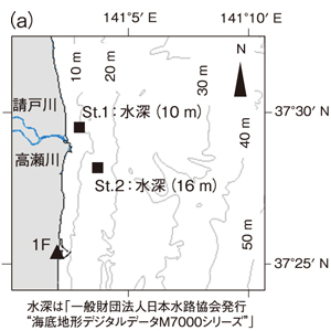 東京電力福島第一原子力発電所(1F)事故後、海産物への放射性物質の移行が懸念されることから、海域では放射性セシウム(137Cs)の挙動を把握する「動態研究」が行われています。事故から12年が経過した現在でも、わずかな量の137Csが河川を介して陸域から海域へ輸送されています。特に沿岸では、海底土や河川から流入する土砂等で形成される濁った領域(高濁度層)が海底付近に存在しています。このような高濁度層中に含まれる137Csは海底に生息する小型生物やそれらを捕食する底生魚へ影響を与える可能性があり、その供給メカニズムの解明が求められています。また、高濁度層は波浪や流れによって容易に移動するため、放射性物質輸送において重要な役割を果たしていると考えられます。そのような河口域の高濁度層と河川からの137Csの流入量・流入時期との関係を把握することは、将来的な底生魚への影響を予測する上で重要な知見となります。そこで本研究では、高濁度層中の137Csに対する河川影響の実態把握を目的とし、沿岸域で調査を実施しました。