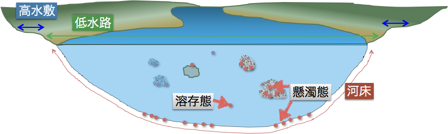 川の濁りの元となる微粒子(浮遊懸濁物質)や堆積物中の微細な土砂粒子等に吸着された状態。