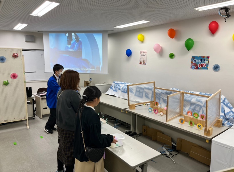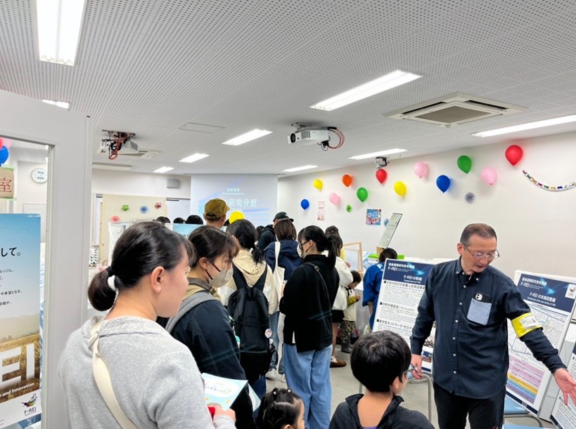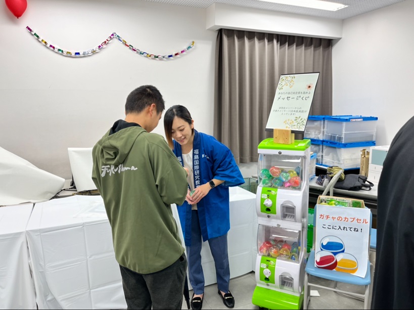 11月2日(土)、福島工業高等専門学校の文化祭(磐陽祭2024)にF-REIのブースを昨年度に引き続き出展させていただきました。今年度は、福島高専(ソーシャル・クリエーション研究会)とのコラボ企画で出展しました。ブース内は学生さんの飾り付けによる縁日をイメージしたもので、射的や輪投げ、ガチャガチャなどがあり、親子で楽しめるブースでした。また、学生さんが企画・製作したF-REI広報シールなどのプレゼントも配布しました。あいにくの雨ではありましたが、ブースには昨年度を上回る500人以上の親子などにご訪問いただき、F-REIについて知っていただく良い機会となりました。