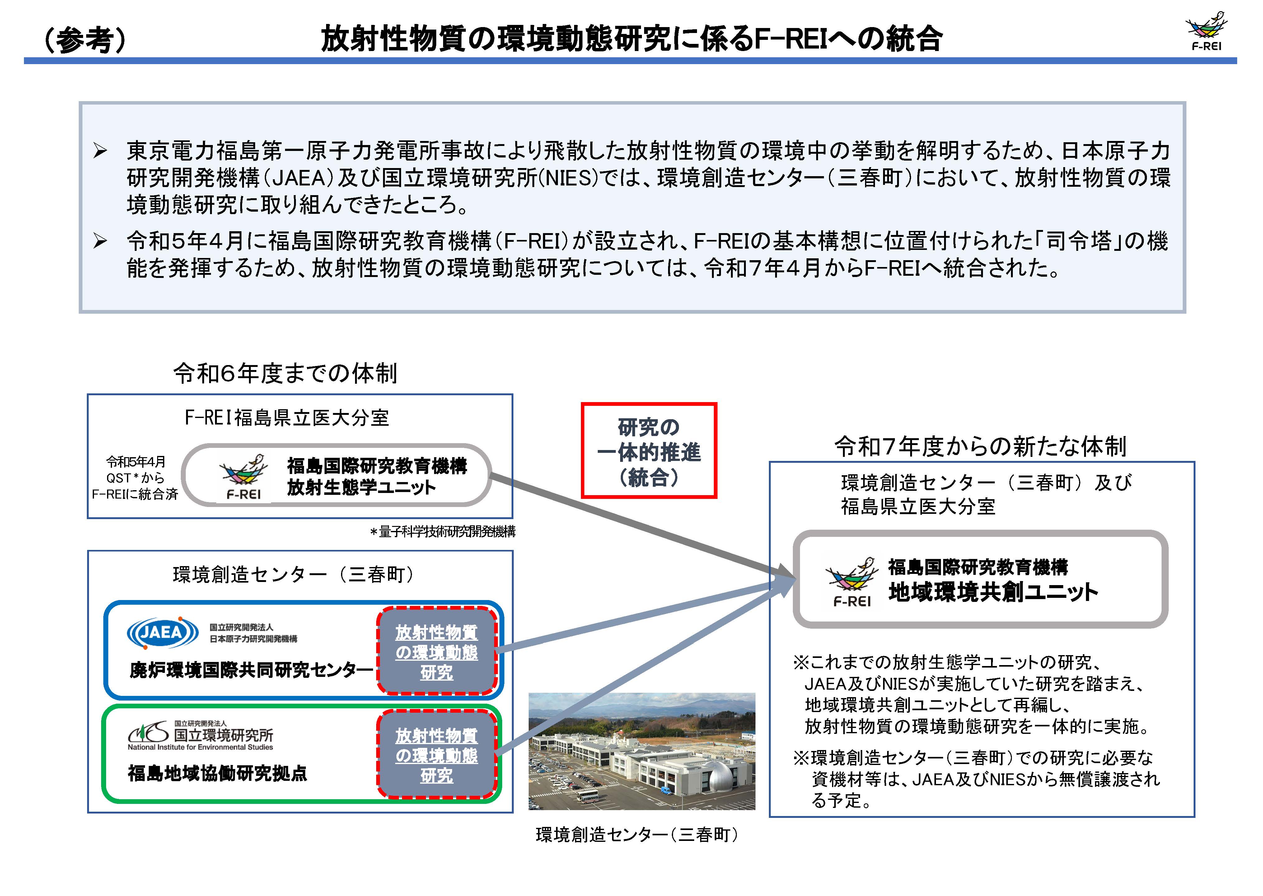 令和7年4月1日(火)、F-REIの基本構想に位置付けられた「司令塔」の機能を発揮するため、JAEA及びNIESが環境創造センター三春町施設において実施していた放射性物質の環境動態研究については、F-REIに統合しました。