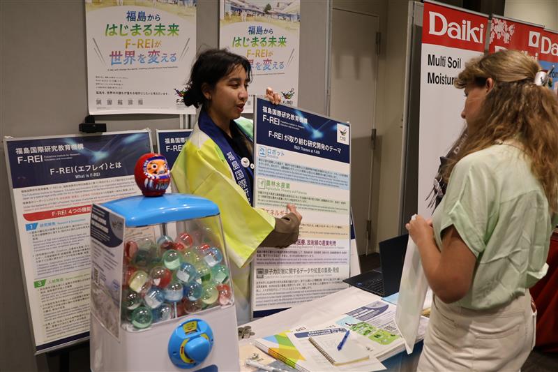F-REIからは、農林水産業分野の藤井一至ユニットリーダーが参加し、ポスター発表や飯舘村での視察現場において土壌に関する説明を行いました。また、19日と22日には会場でブースを出展し、来場者に対してF-REIの取組や研究内容を紹介しました。さらに、初日のウェルカムパーティでは、山崎理事長による開催に向けたメッセージ動画も上映され、F-REIの国際的な発信力をアピールしました。