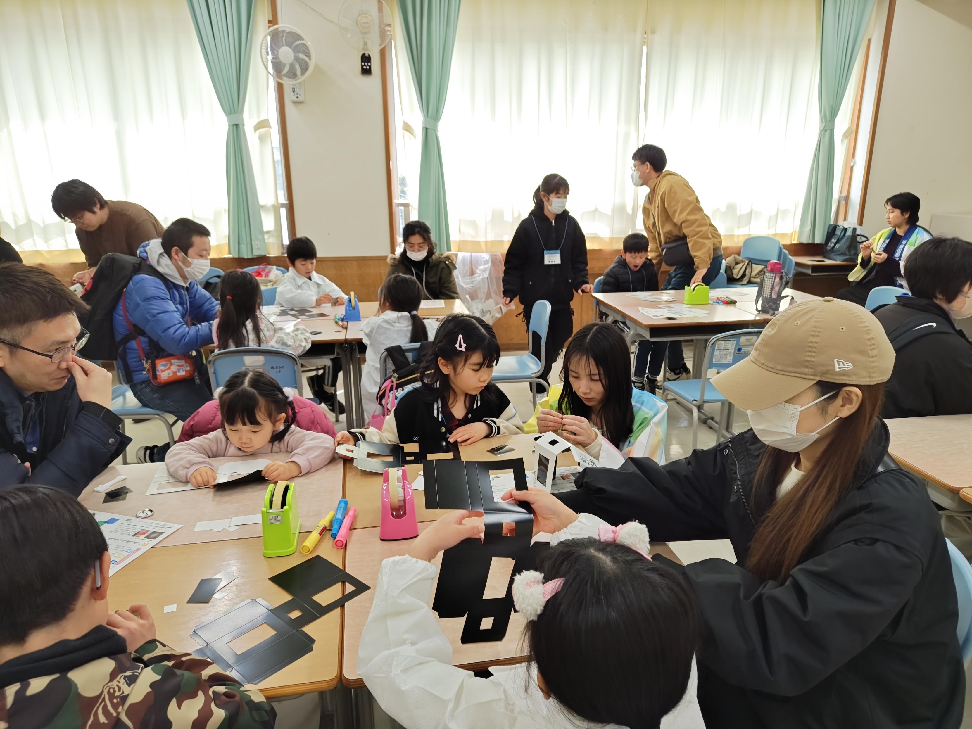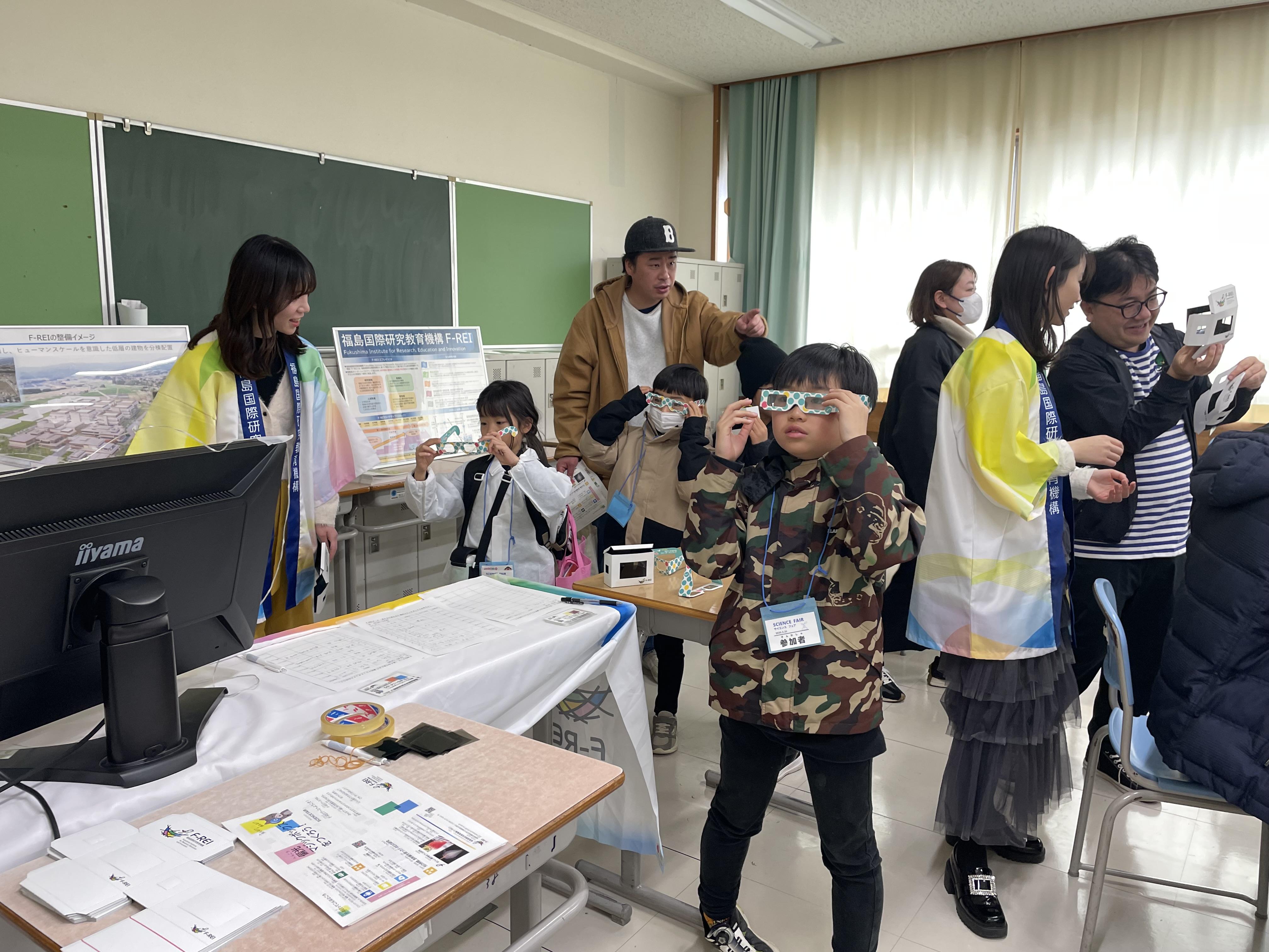 今回のサイエンスラボでは、「見える!?消える!?偏光マジックボックスを作ろう!」と題して実施し、光の性質である「偏光」を使って、"見えるけど存在しない壁"を作る実験を行いました。同イベントには200名の小学生とその保護者が参加しており、当日は、復興庁職員のご協力もいただきながら、F-REIのブースに訪れた計82名の児童と保護者に光の性質について、楽しく学んでいただきました。