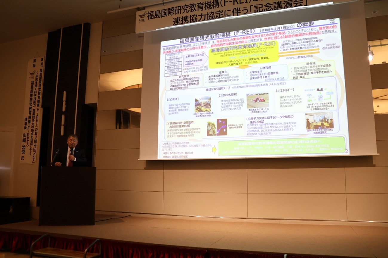 また当日は、山崎理事長より、「福島国際研究教育機構(F-REI)の取組について~未来を拓く科学技術力・産業競争力の拠点を目指して~」と題し、地元企業の経営者の皆さまに向けて、記念講演を行いました。