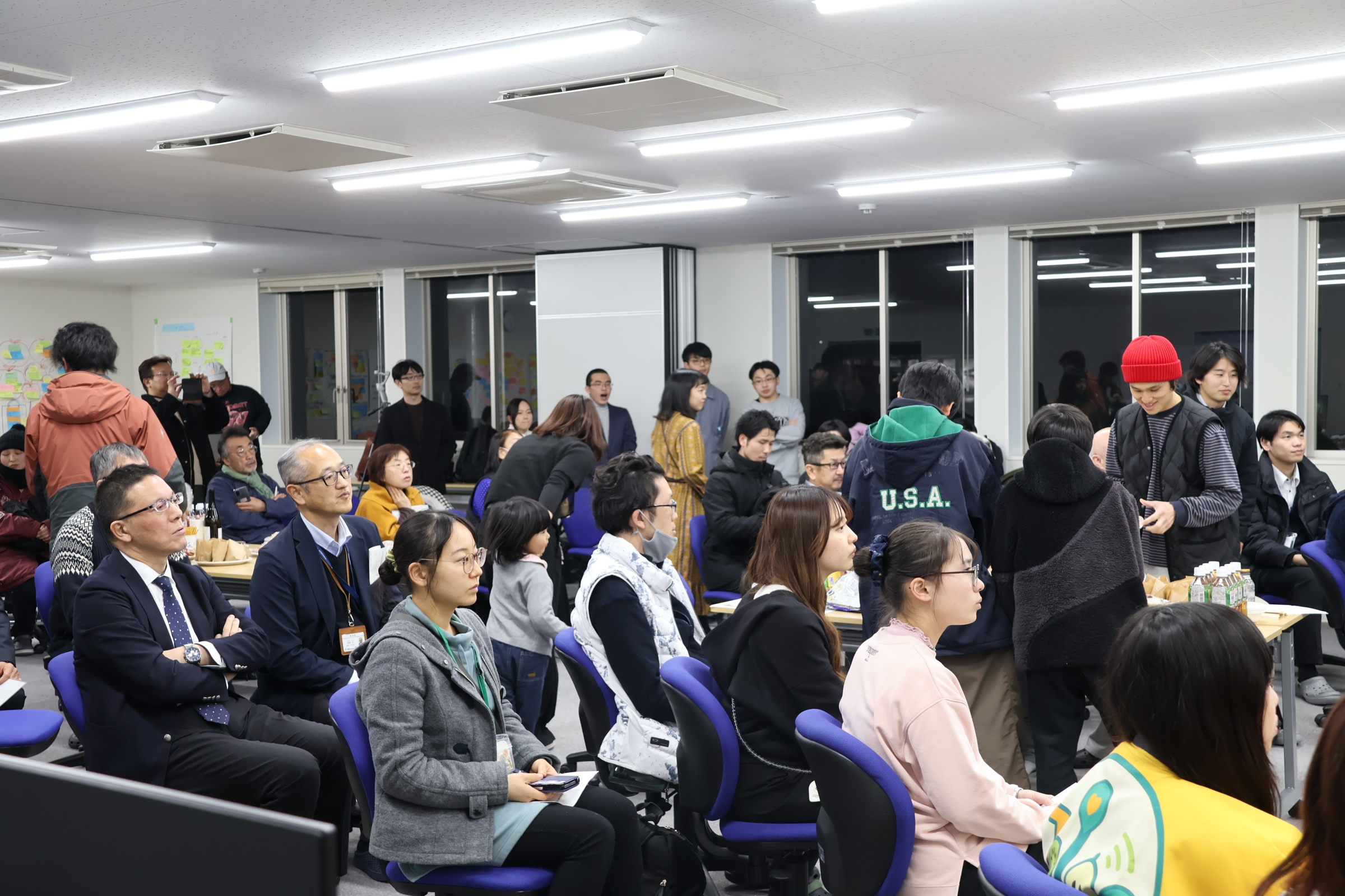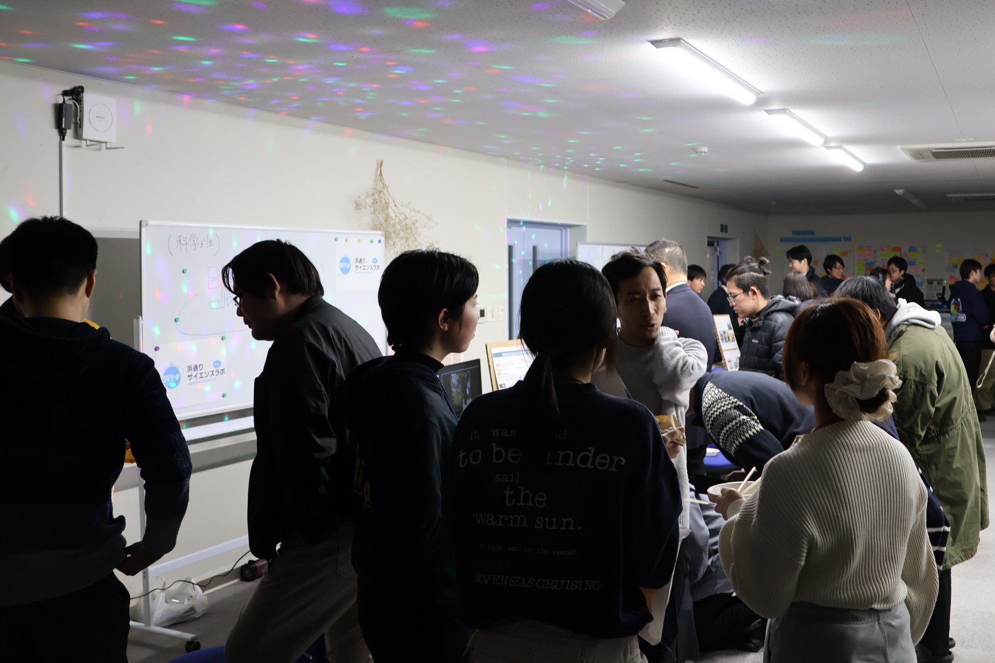イベント後半には、「DJ Night」と題した交流会を実施しました。浪江町のSTUDIO B-6を拠点に活動するDJ集団「CLUBSIX」のメンバーであるDJ MASHUによる音楽のもと、会場は心地よい音に包まれ、リラックスした雰囲気の中で交流が行われました。同時間帯には発表を行った学生がブースを出し、参加者が説明に耳を傾けるなど、活発な対話が生まれる場面も多く見られました。