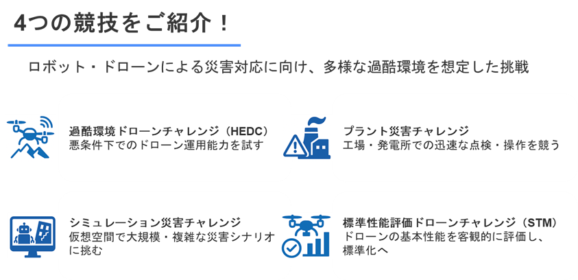 これらの競技には、日本国内のみならず海外からも多くの研究機関・大学・企業が参加を予定しており、国際的な技術交流の場ともなります(参加チームについては後日の記事で紹介します)。技術者や研究者にとっては、新しい知見の共有や連携を深める貴重な機会であり、社会にとっては将来の防災・減災技術の発展につながるものです。